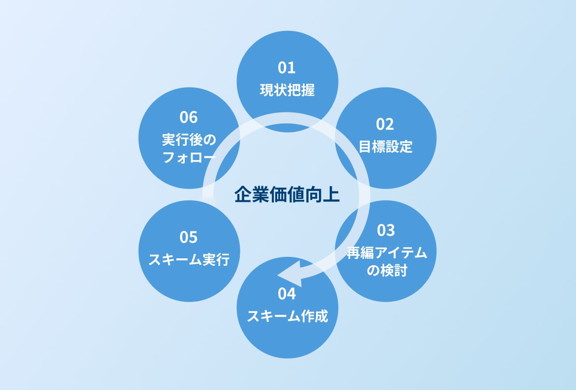 辻󠄀・本郷 税理士法人では、国内最大規模の組織力を活かし、多種多様なスキームで、企業価値の向上を見据えた最適な再編プランを提供してまいりました。
