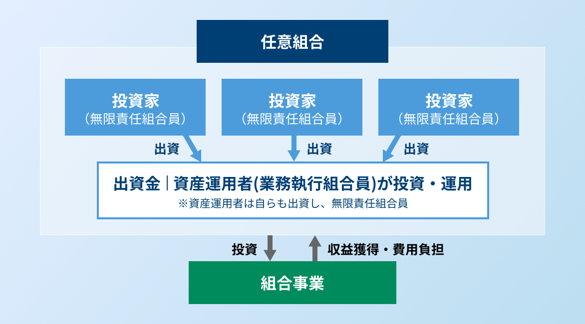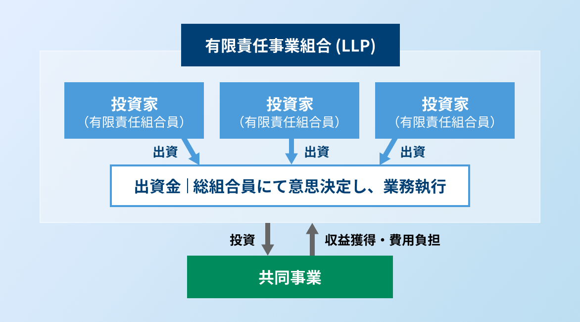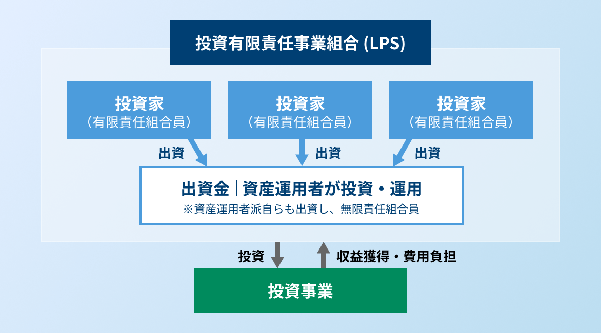 業務を執行する無限責任組合員(GP)と有限責任組合員(LP)から構成され、それぞれ1名以上必要となり、有限責任組合員は出資額を限度とした有限責任性が認められます。