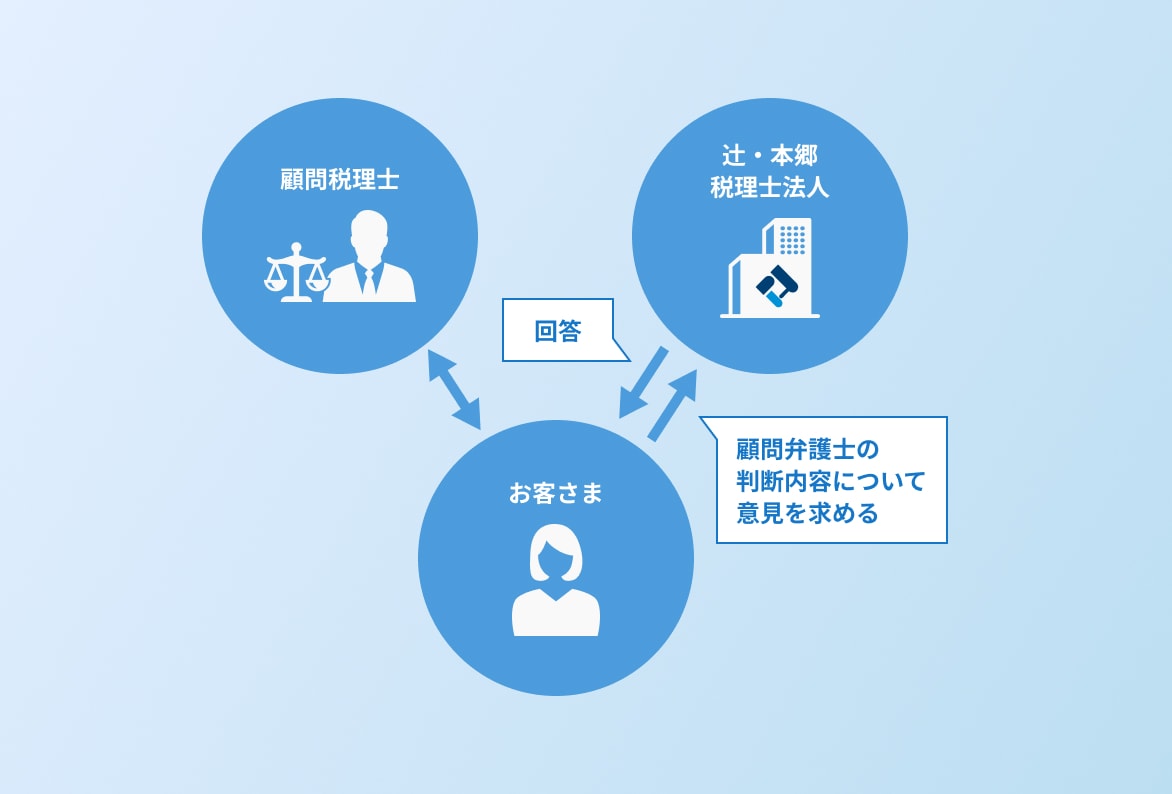 私どものセカンドオピニオンでは、税金の払いすぎのチェックだけにとどまらず、税法の解釈、税務調査対応の実例に基づく見解など、難解な税務問題に対し豊富な解決実績を持つ専門部門が、包括的かつ信頼性の高いご提案を行っています。 顧問税理士とのおつきあいはそのままで、別の税理士に意見を求めることができる、辻󠄀・本郷の「セカンドオピニオン」サービスをご利用ください。