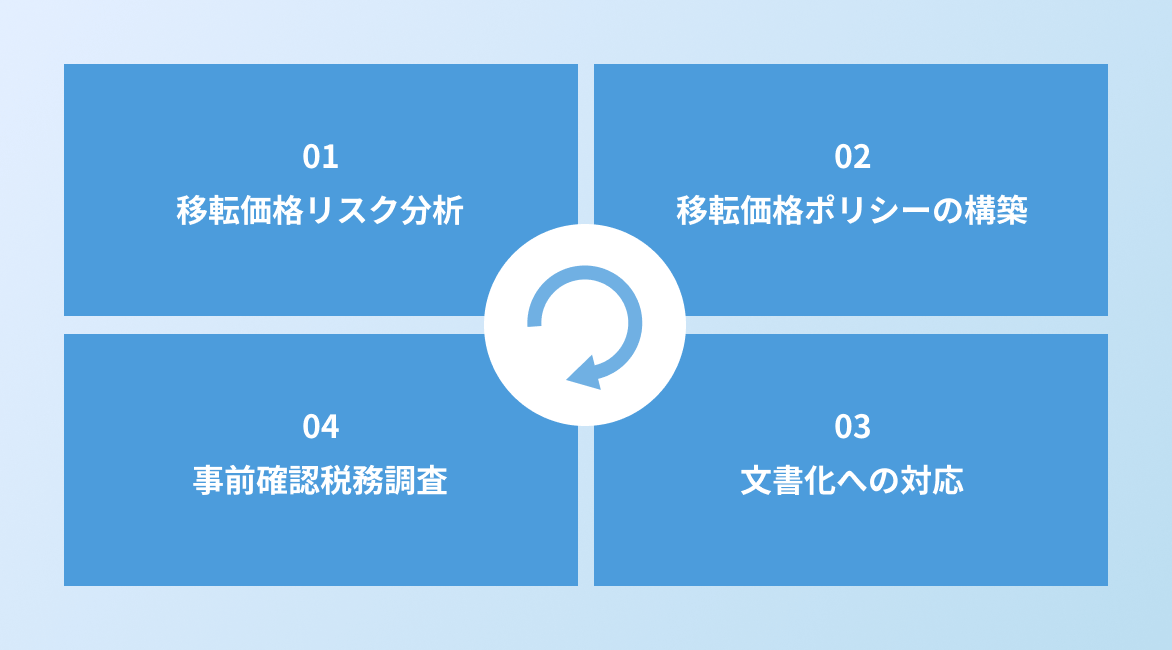 辻󠄀・本郷 税理士法人では、移転価格ライフサイクルと呼ばれる移転価格リスク分析(1)、移転価格ポリシーの構築(2)、文書化への対応(3)、事前確認・税務調査(4)の一連の過程を通じて、お客さまと一体となって業務を進めてまいります。