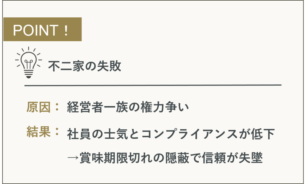 不二家の失敗は、デメリットで挙げた「ワンマン経営」や「公私混同」「後継者の力不足」により引き起こされた代表例です。
