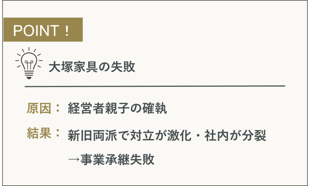 大塚家具の事例は、まさに「事業承継の失敗」がこじれてしまった代表例です。