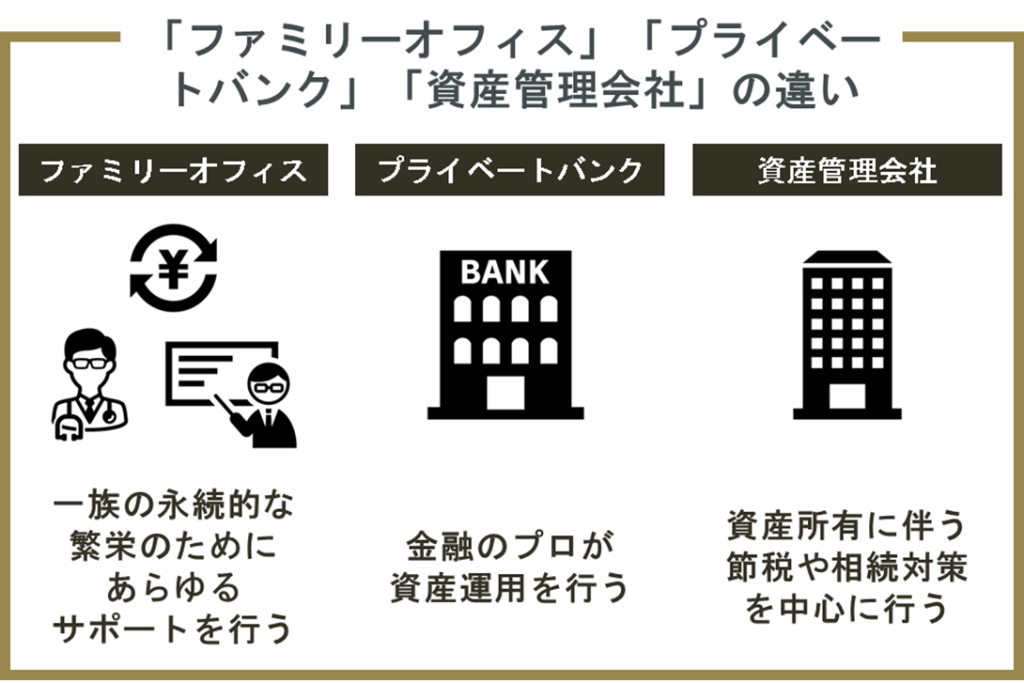 似たような役割のものとして、「プライベートバンク」や「資産管理会社」がありますが、これらとファミリーオフィスは役割が異なります。