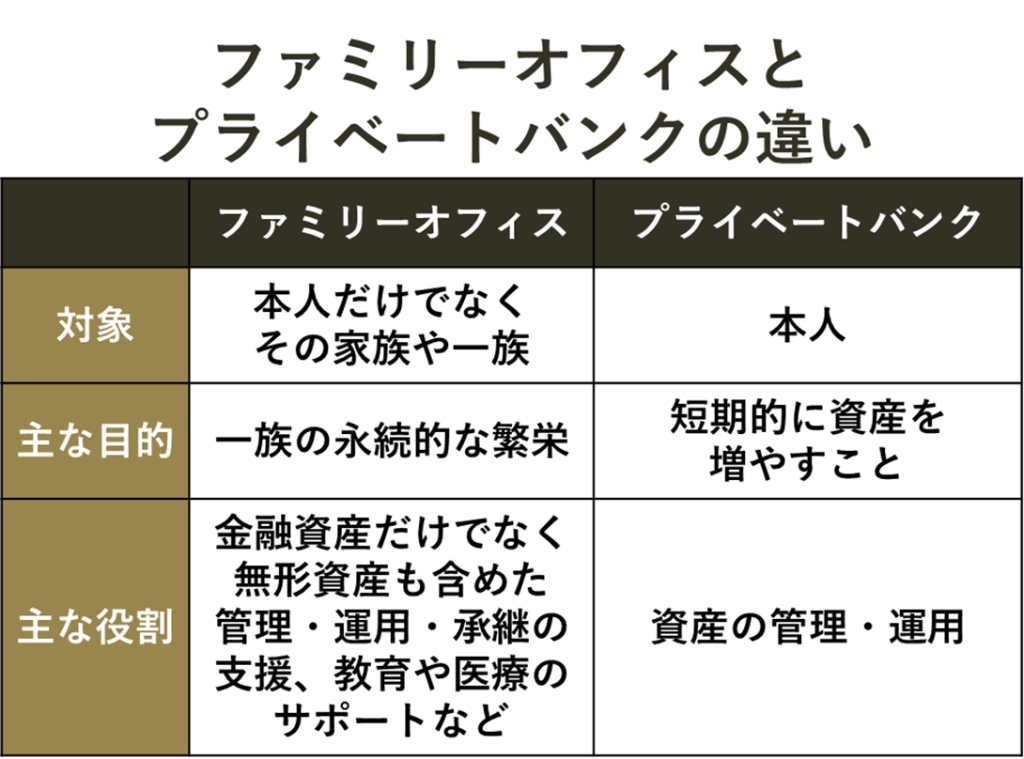 「ファミリーオフィス」のほうが「プライベートバンク」や「資産管理会社」よりも目指すゴールが高く、幅広い対象・範囲へサポートを行っていくという性質があるのです。