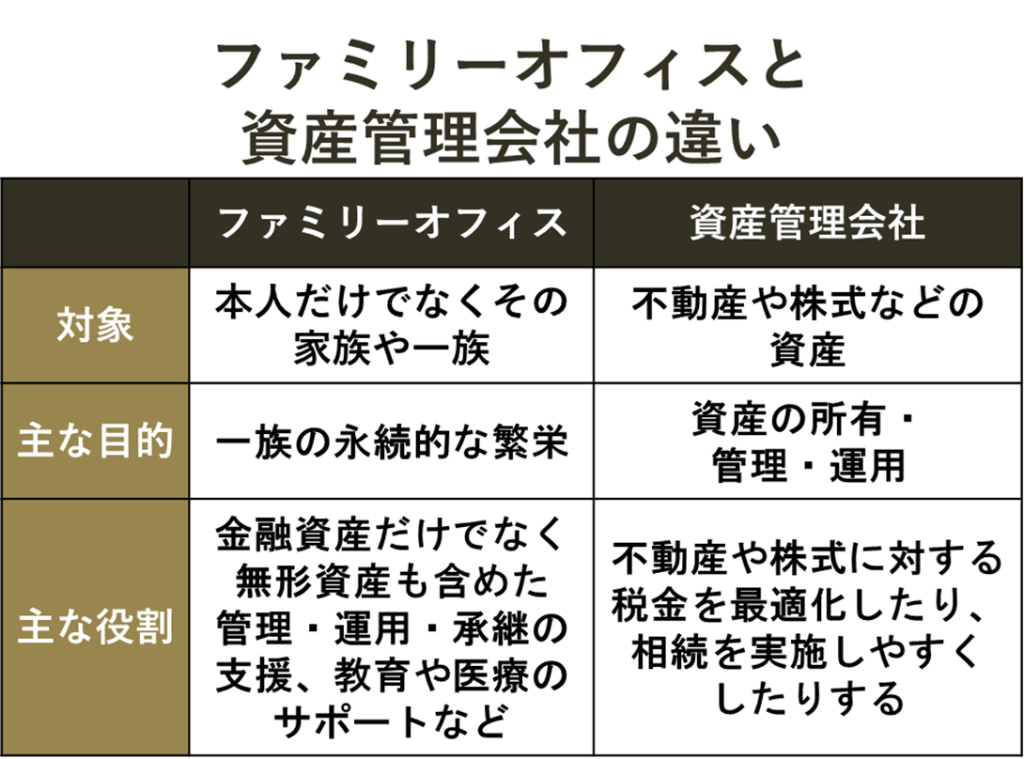 ファミリーオフィスと資産管理会社の違いをまとめた表は次の通りです。