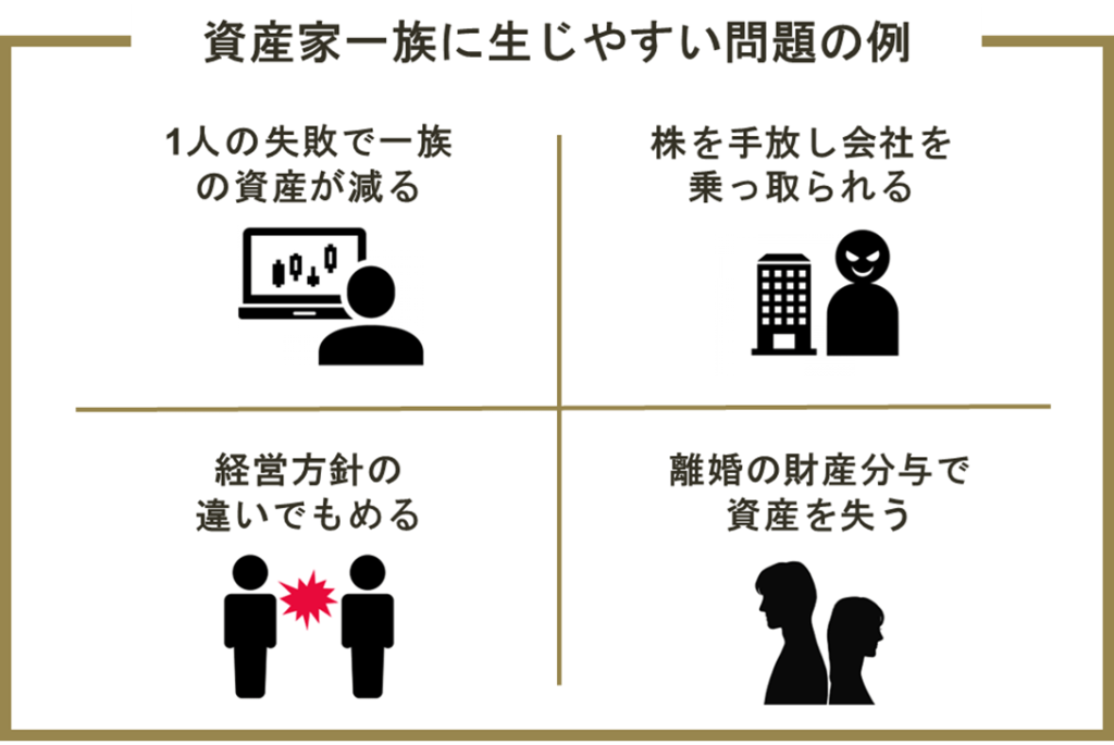 | ・ 資産の大部分を所有している人の投資ミスや不十分な節税対策などによって、一族全体の資産が減ってしまう ・ 事業を行っている場合に、その方向性について親子や兄弟間でもめてしまい、経営に悪影響が出る ・ 株式の管理が不十分で、事業を他者に乗っ取られる ・ 離婚に伴う財産分与によって、多額の資産を失う |