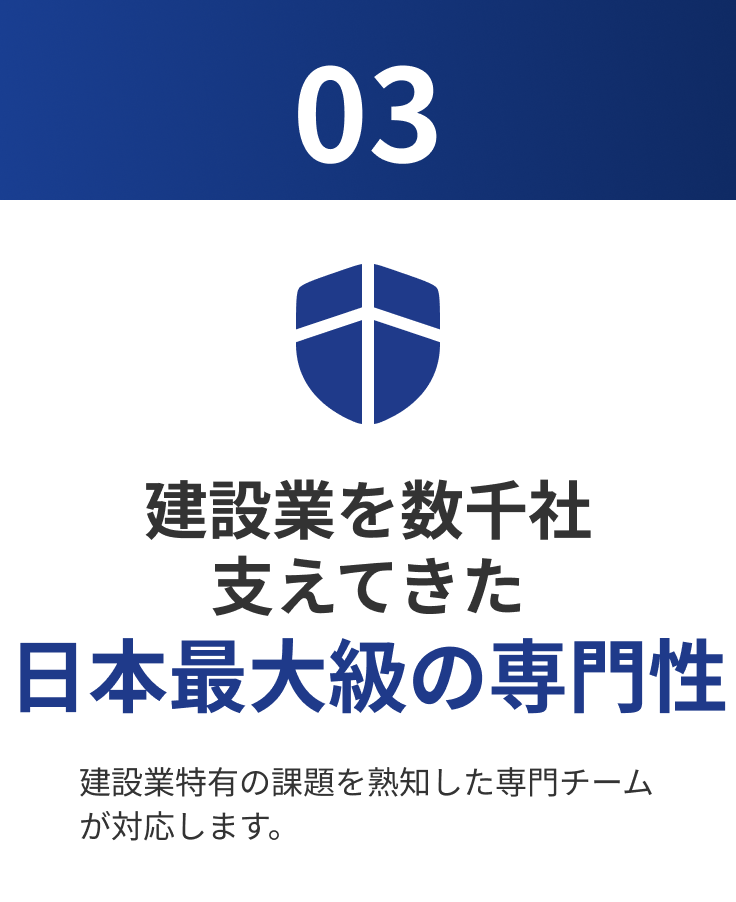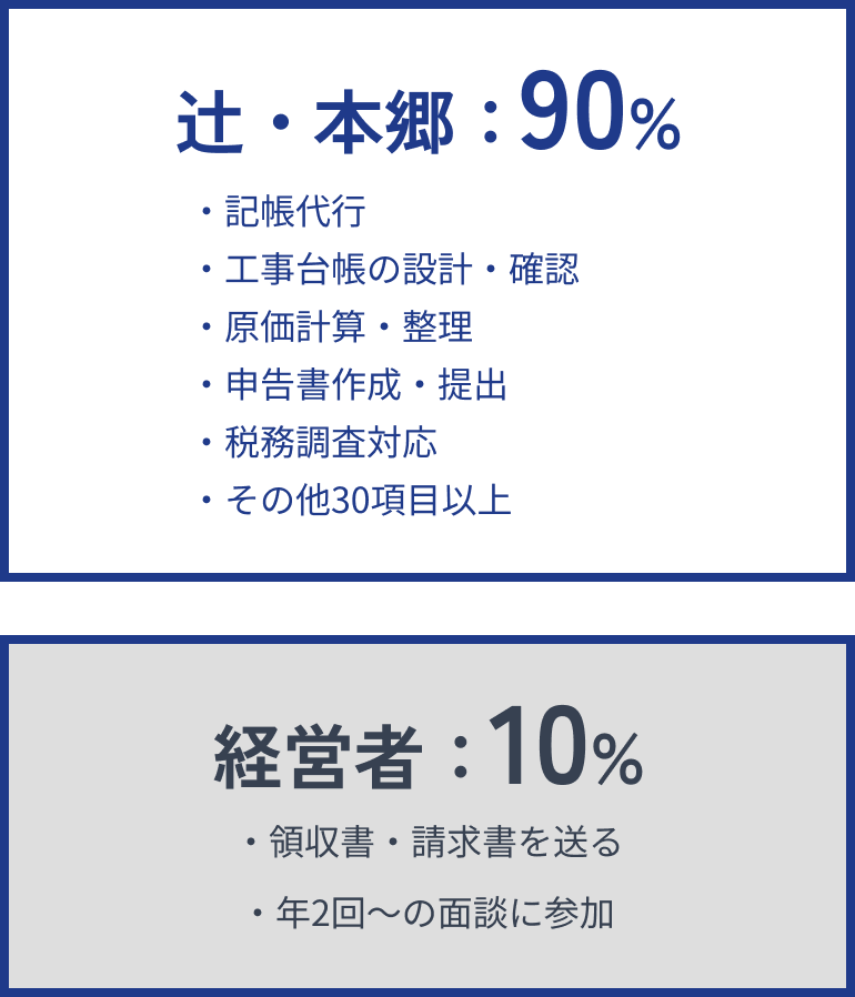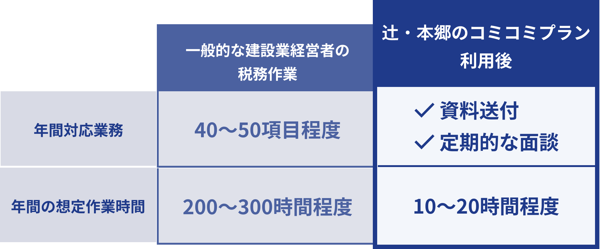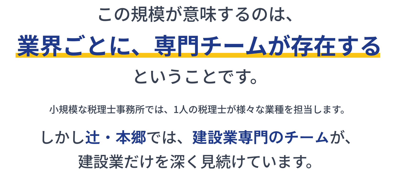 建設業に特化した辻󠄀・本郷のチームで業務をパッケージ化し、 効率的に対応しているからです。