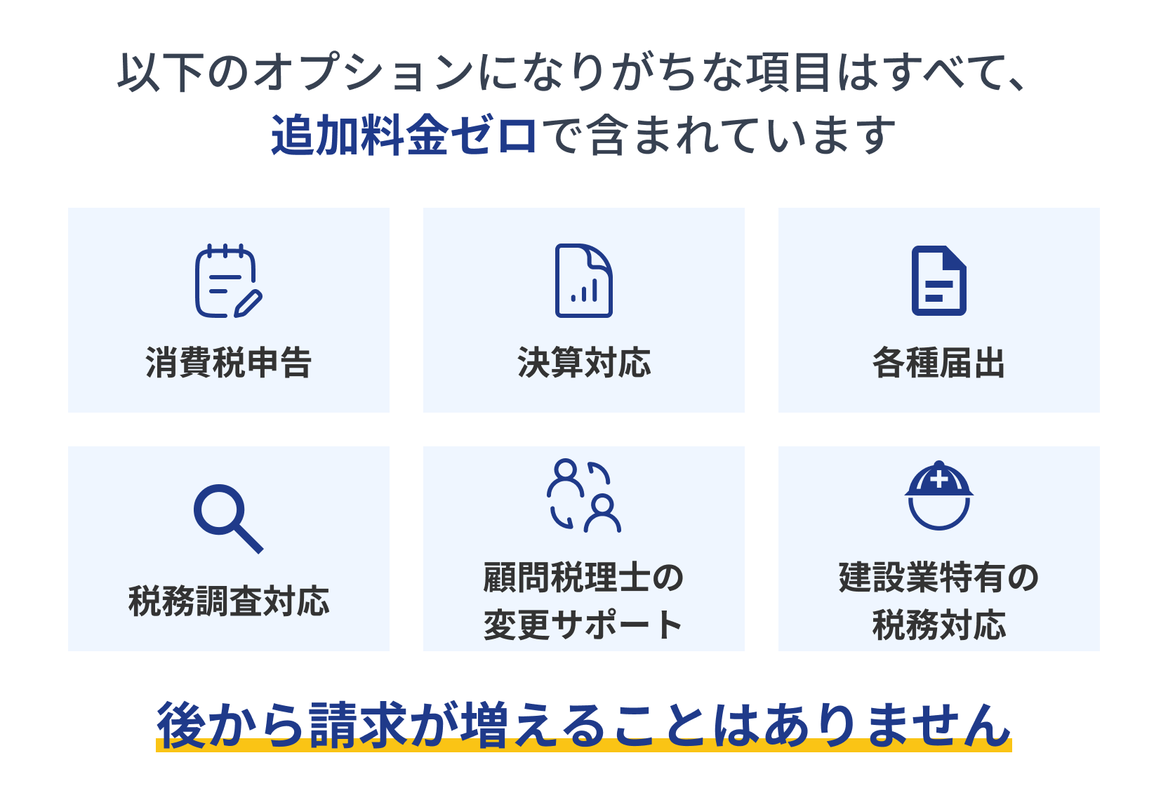 ※決算料・消費税申告・月々の消費税関連のサポート・追加料金すべてコミコミの、料金体系が明確なプランです。