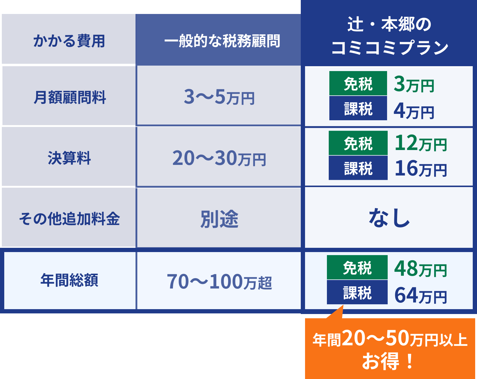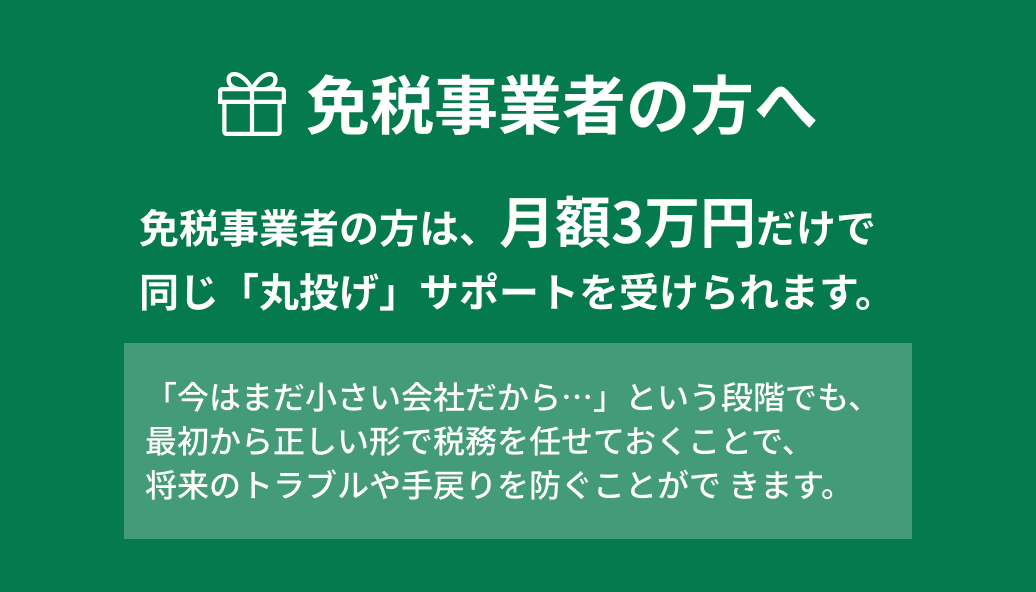 ※顧問料は月額3万円(免税)/4万円(課税)+決算料12万円(免税)/16万円(課税)+追加料金ゼロ!