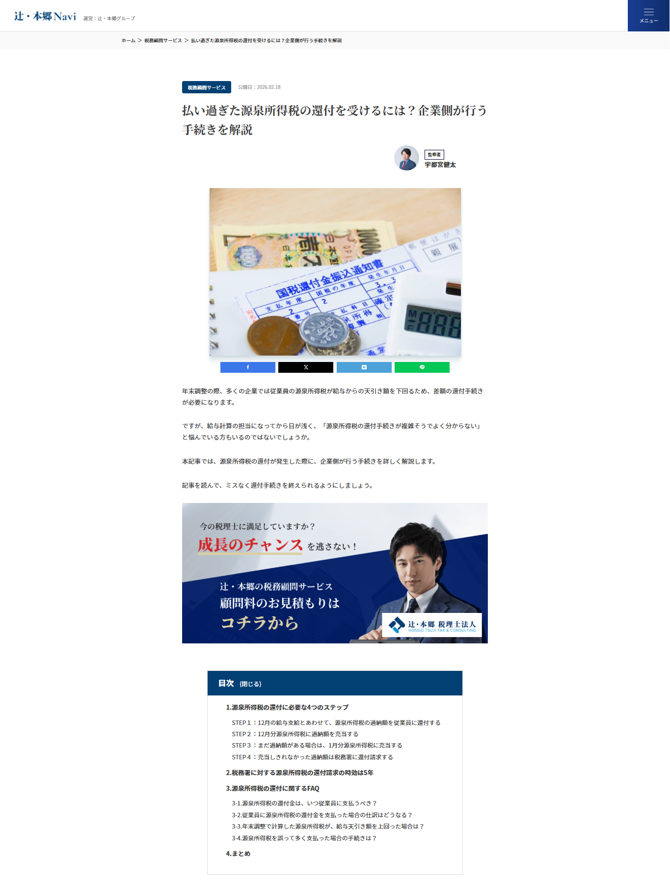 2026.02.18「払い過ぎた源泉所得税の還付を受けるには?企業側が行う手続きを解説」をアップロードしました辻・本郷Naviで「払い過ぎた源泉所得税の還付を受けるには?企業側が行う手続きを解説」をアップロードしました