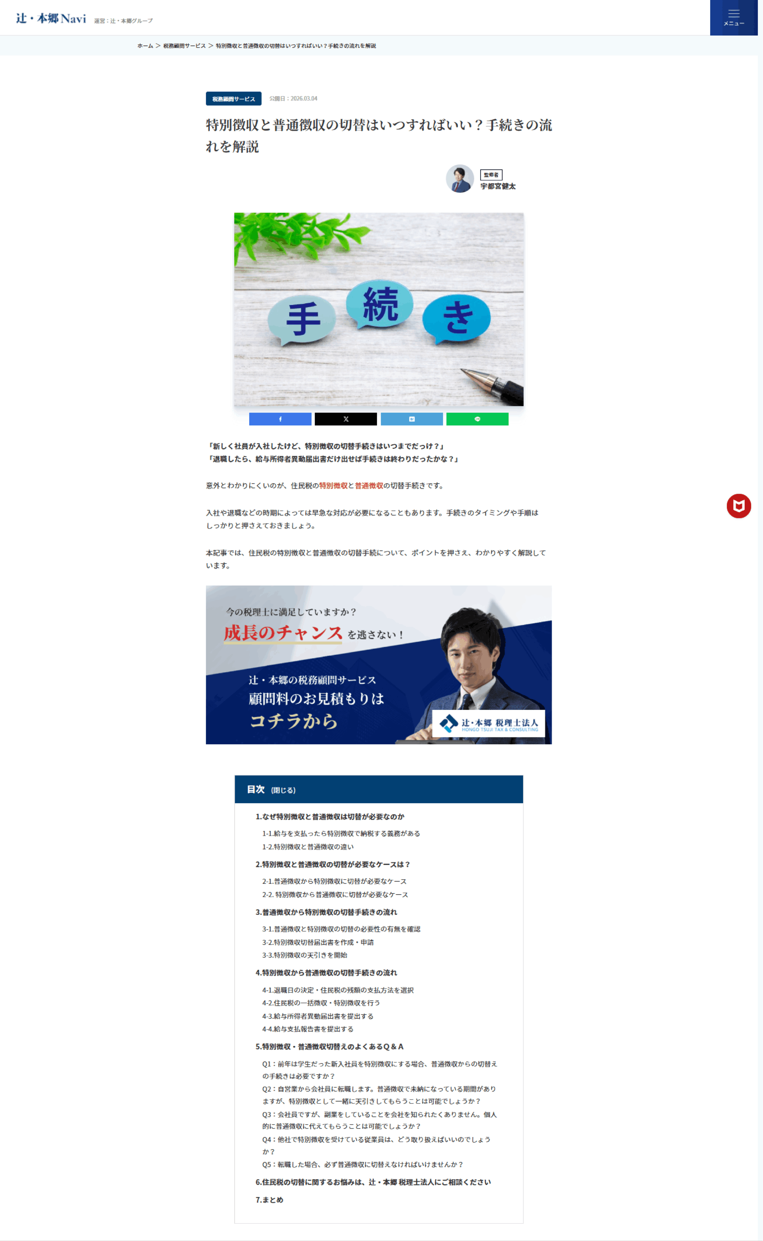 2026.03.04「特別徴収と普通徴収の切替はいつすればいい?手続きの流れを解説」をアップロードしました辻・本郷Naviで特別徴収と普通徴収の切替はいつすればいい?手続きの流れを解説をアップロードしました