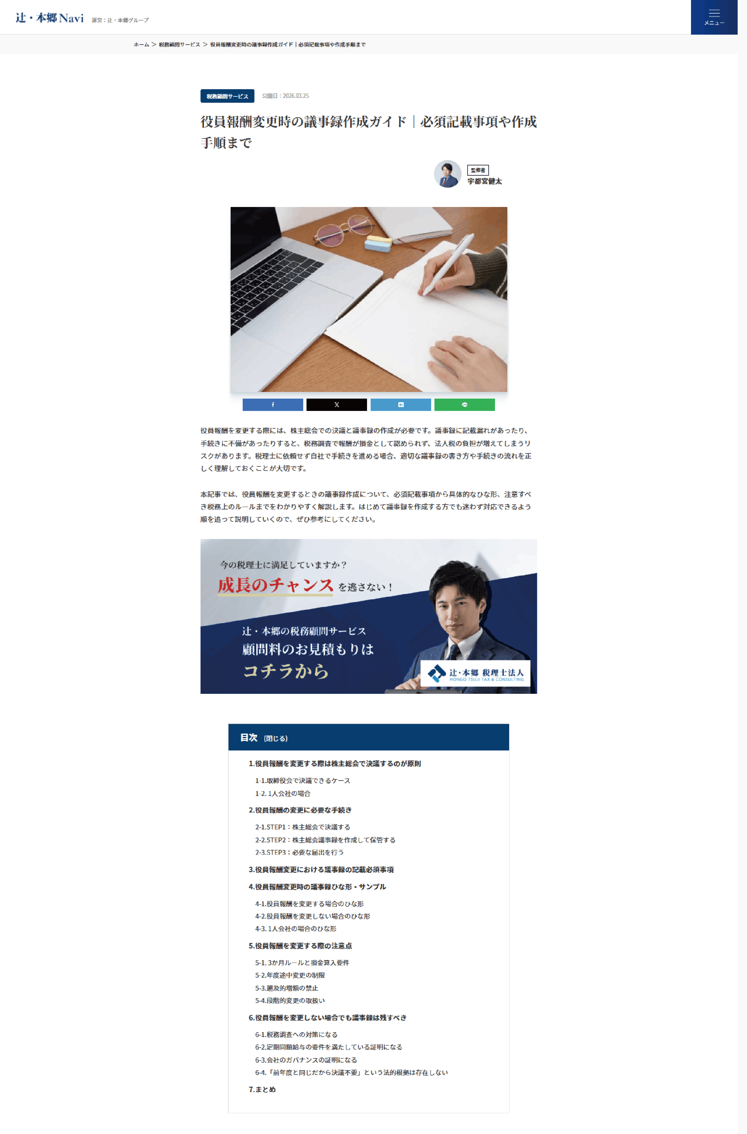 2026.03.25「役員報酬変更時の議事録作成ガイド|必須記載事項や作成手順まで」をアップロードしました辻・本郷Naviで「役員報酬変更時の議事録作成ガイド|必須記載事項や作成手順まで」をアップロードしました