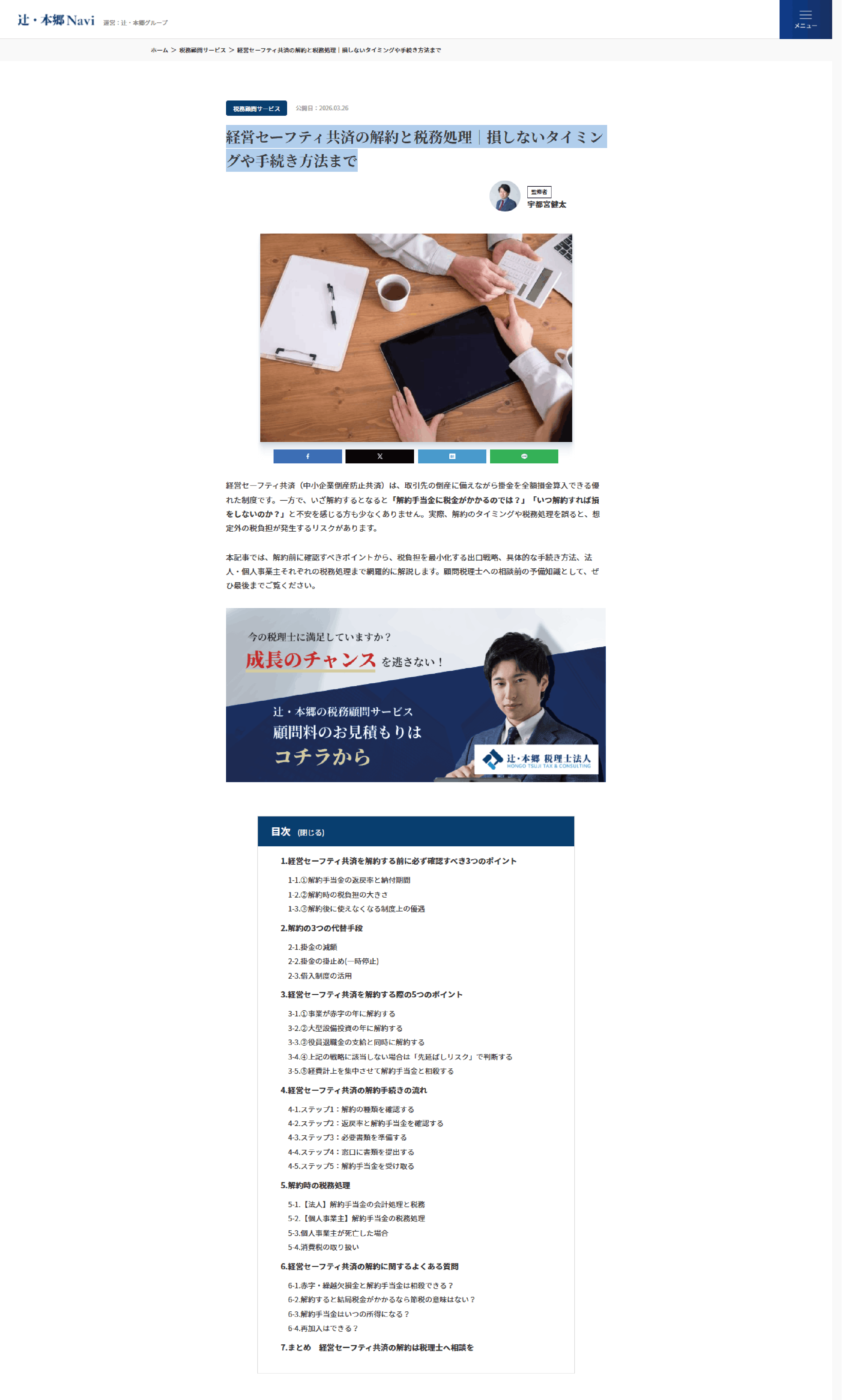 2026.03.26「経営セーフティ共済の解約と税務処理|損しないタイミングや手続き方法まで」をアップロードしました辻・本郷Naviで「経営セーフティ共済の解約と税務処理|損しないタイミングや手続き方法まで」をアップロードしました
