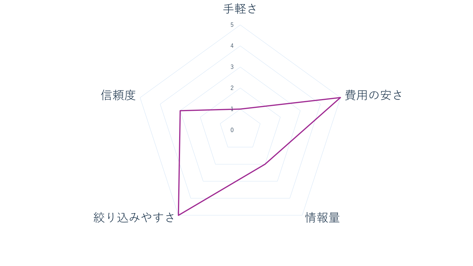 | 手軽さ | 費用の安さ | 情報量 | 絞込やすさ | 信頼度 | |