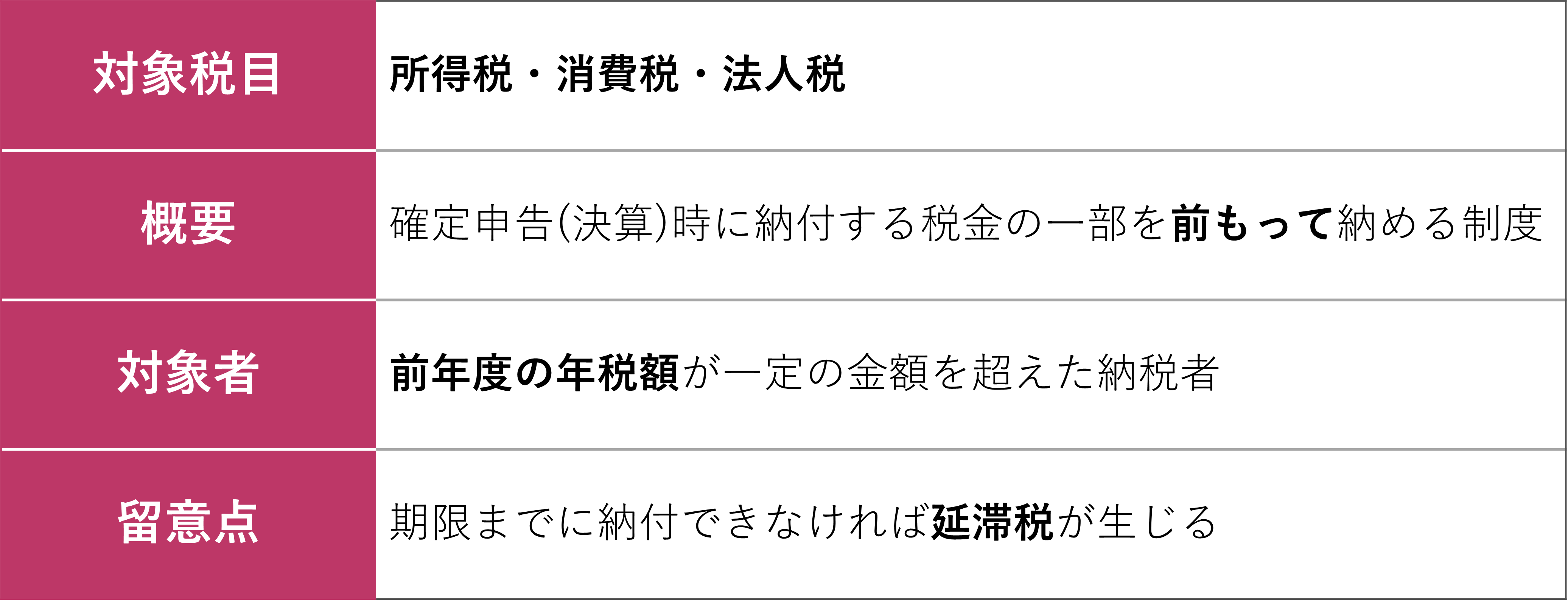 予定納税・中間納付とは、税金の前払いであり対象の税金は所得税・法人税・消費税の3つ。