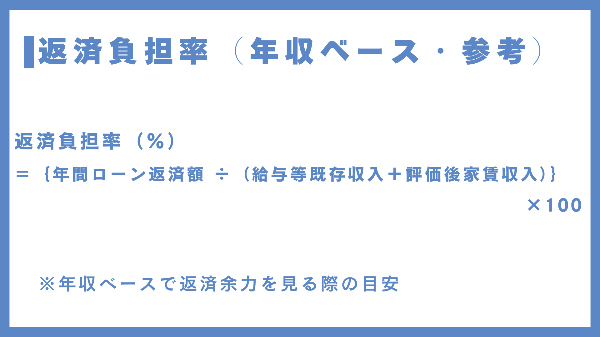 ・総合的な支払余力(返済負担率):年収と物件収益を踏まえて返済に余裕があるか