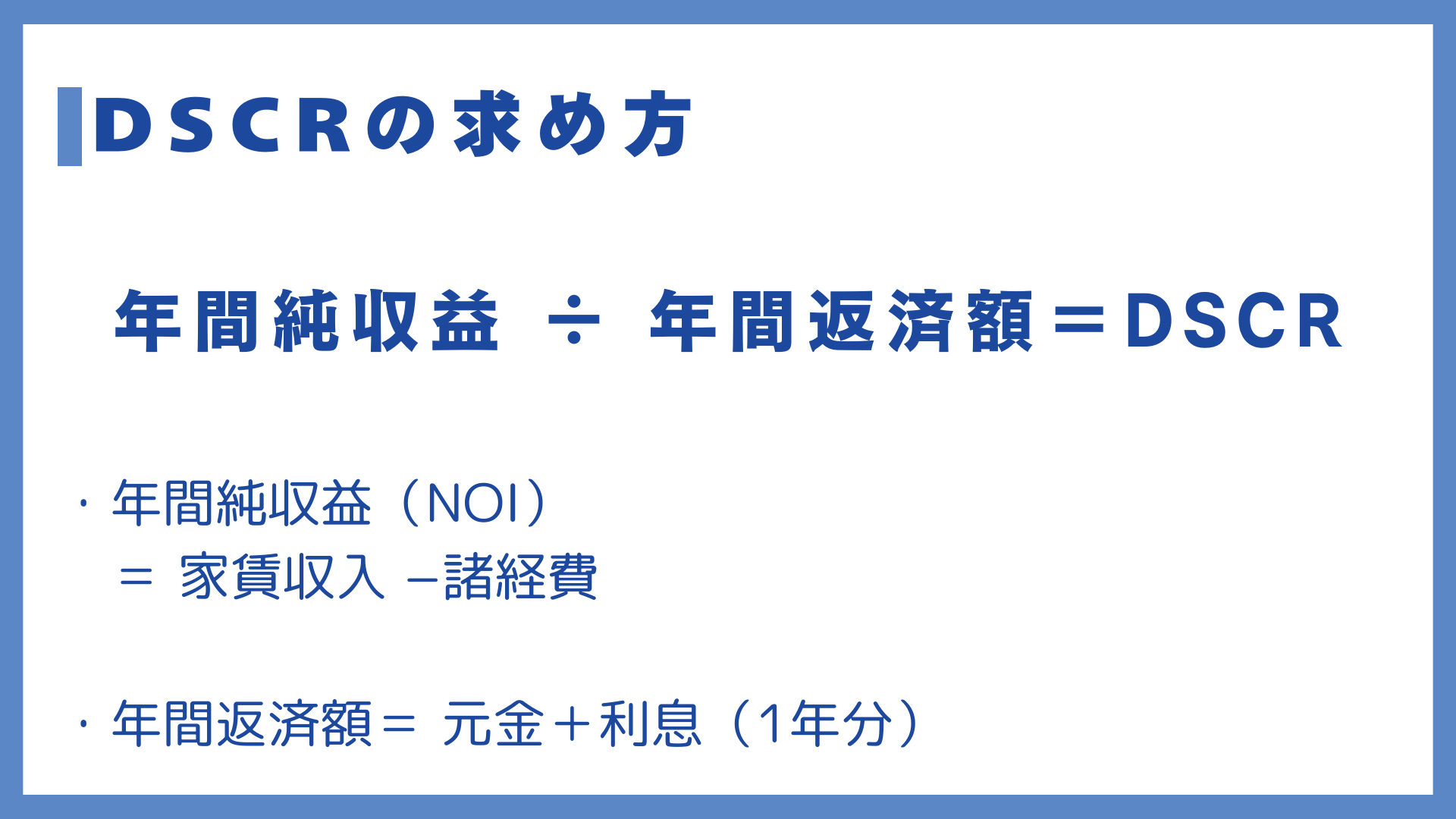 「家賃収入できちんと借入金を返済できるか」を示す指標を、「DSCR」(借入金償還余裕率)と言います。