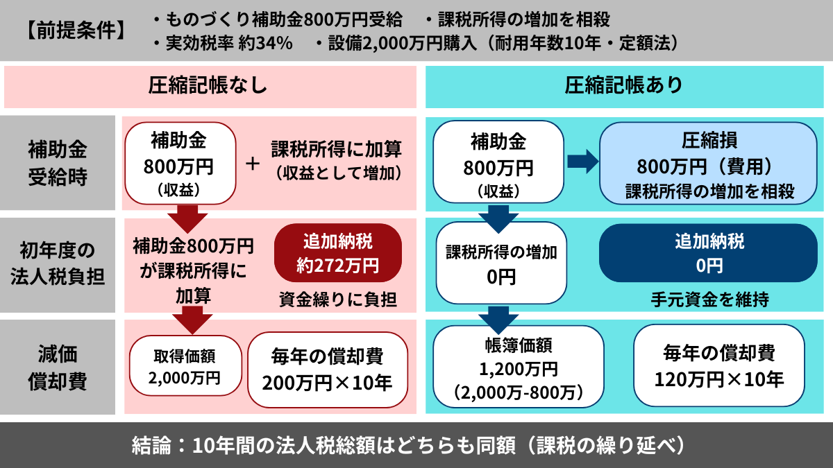ものづくり補助金800万円を受給し、2,000万円の設備(耐用年数10年・定額法)を購入したケースで、圧縮記帳の有無による違いを比較します。