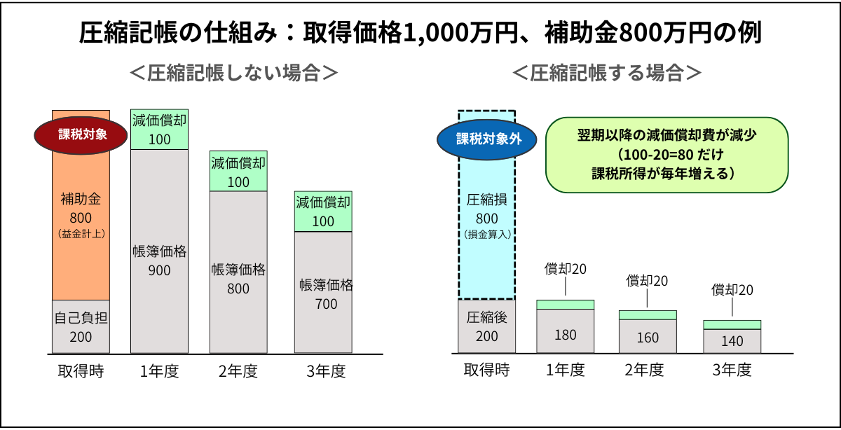 たとえば800万円の圧縮記帳を行った場合、取得年度には800万円分の課税所得が減少しますが、帳簿価額が減額された分だけ翌年度以降の減価償却費が小さくなり、その分の課税所得が増加します。結果として、耐用年数を通じたトータルの納税額は同額に収束します。