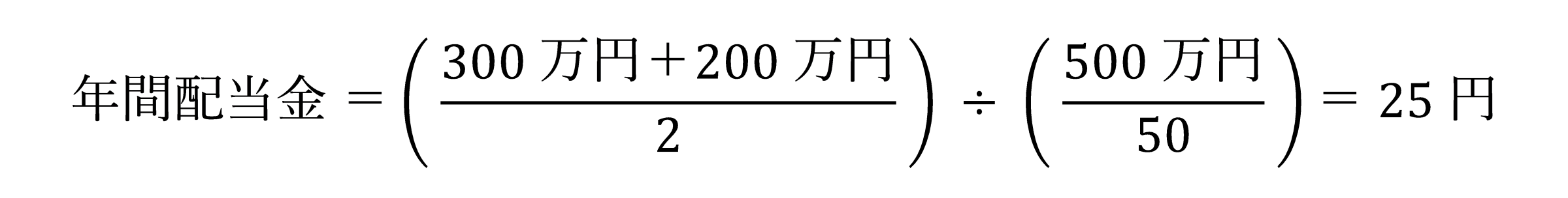 つまり、①過去2年間の「年間配当金額の平均値」を、②1株あたりの資本金を50円として算出した値(=「発行済株式数」)で割ることで、1株あたりの「年間配当金額」を求めることができます。