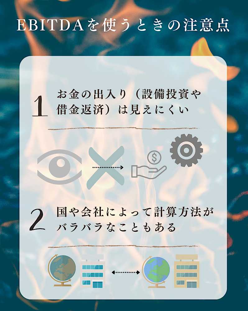 EBITDAはとても便利な数字ですが、いいことばかりではありません。使うときには「ここに気をつけて!」というポイントもあります。