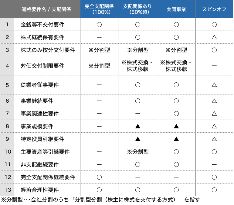 ※実務上は要件を満たしていても非適格と判断されるケースがある場合や、会社の実情上必ずしも適格組織再編が最適とはならないケースも存在します。