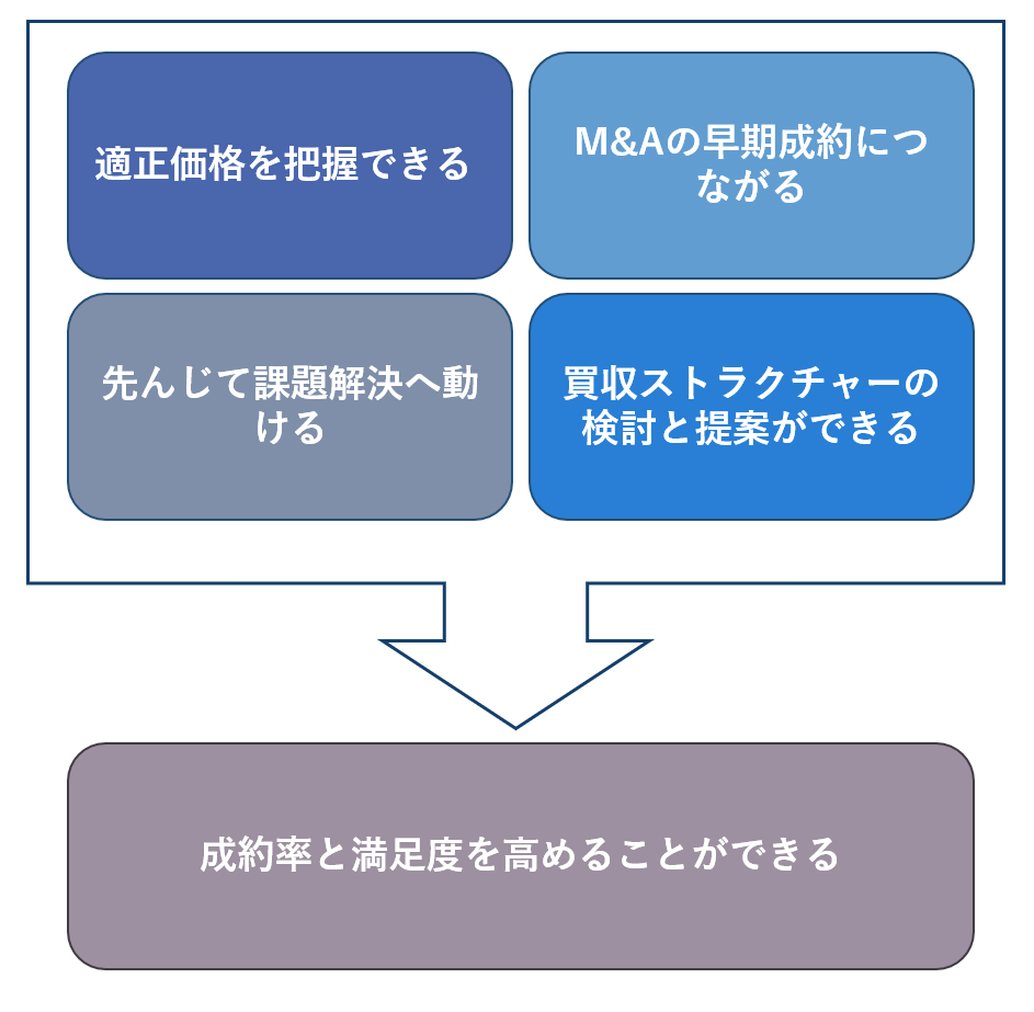 適正価格の把握、あらかじめの課題解決、M&Aの効率化等は、買い手とのスムーズな交渉につながるため、成約率を高めます。またこれらによって主体的にM&A交渉を行えるため、M&Aそのものの満足度も高まるでしょう。