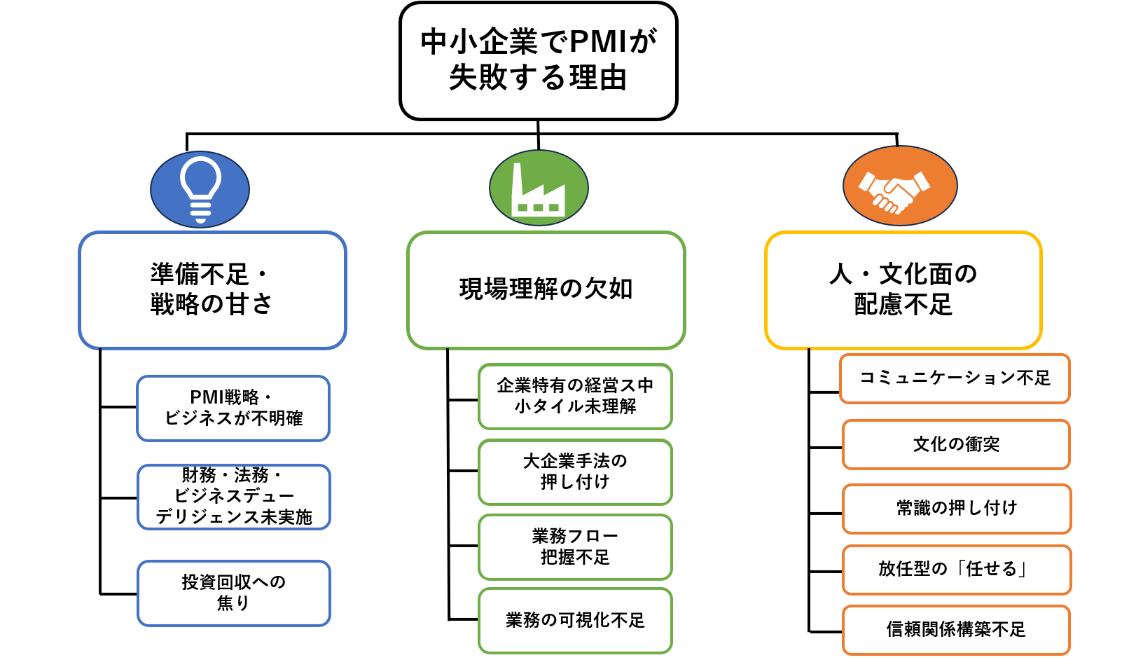 M&Aの後の統合作業であるPMIは中小企業において特有の課題を生みやすく、失敗に至るケースも少なくありません。なぜうまくいかないのか、3つの観点に整理してご紹介します。