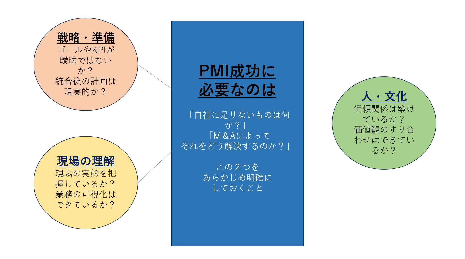 ただし、PMIは「うまくいけば良い」というものではなく、買収の目的を実現するために必ず成功させなければならない重要なプロセスです。