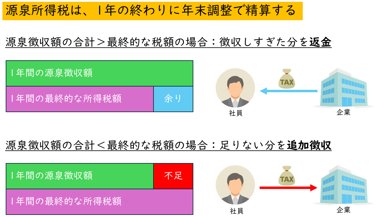 給与や賞与から源泉所得税を徴収する場合、おおまかな税額を差し引いておいて、1年の終わりに「年末調整」で正しい金額との差額を精算(返金または追加徴収)する仕組みになっています。