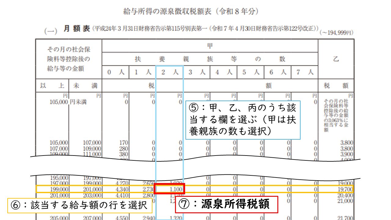 上記のうち、手順5~7の例(出典:国税庁ホームページ「給与所得の源泉徴収税額表(令和8年分) 」(一)月額表を一部抜粋・加工)