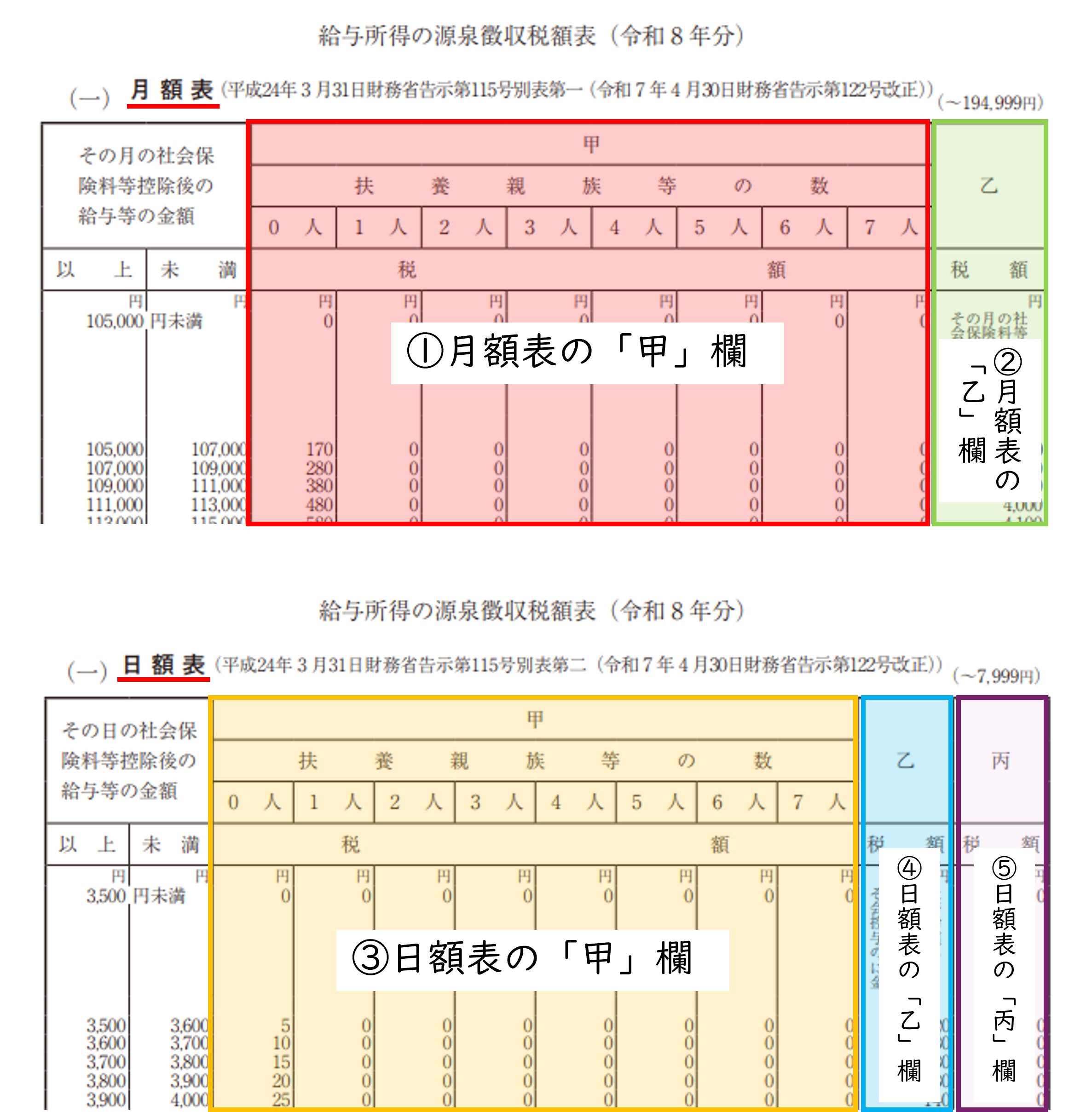 税額表には「月額表」と「日額表」があり、それぞれの表は「甲」、「乙」及び「丙(日額表のみ)」の欄に分かれています。