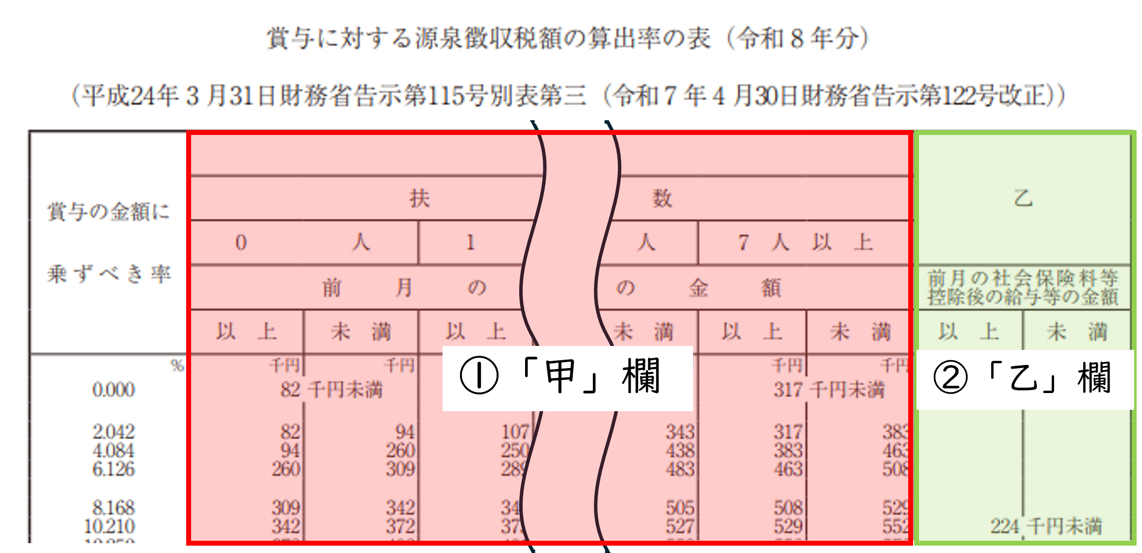 (出典:国税庁ホームページ「賞与に対する源泉所得税額の算出率の表(令和8年分)」を一部抜粋・加工)