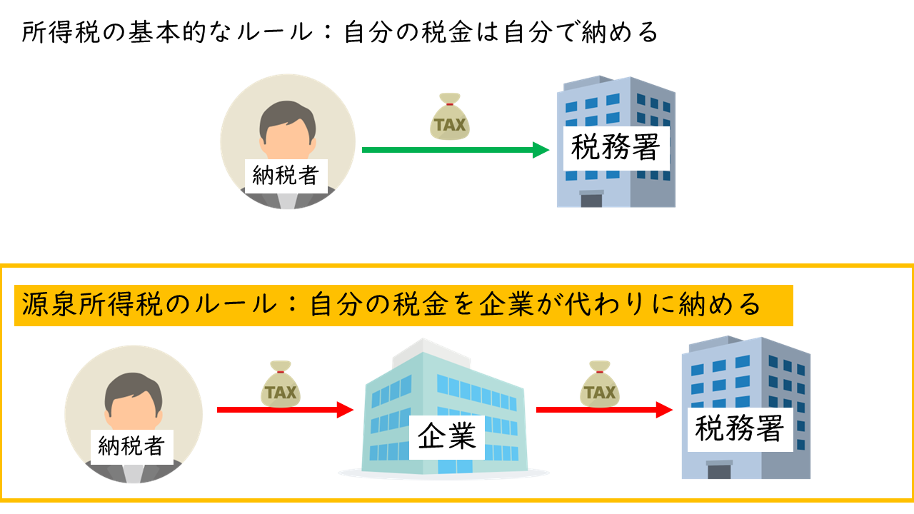 源泉所得税(源泉徴収される所得税及び復興特別所得税)は、給与や報酬などを支払う側(主に企業)が、相手の所得税を給与から差し引いて、代わりに国へ支払う仕組みになっています。