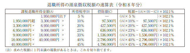 (引用元:国税庁ホームページ「退職所得の源泉徴収税額の速算表(令和8年分)」) - 「(4の課税退職所得金額×5の所得税率-5の控除額)✕102.1%」を計算して、退職金の源泉所得税額を算出する(税額のうち、1円未満の端数は四捨五入する)