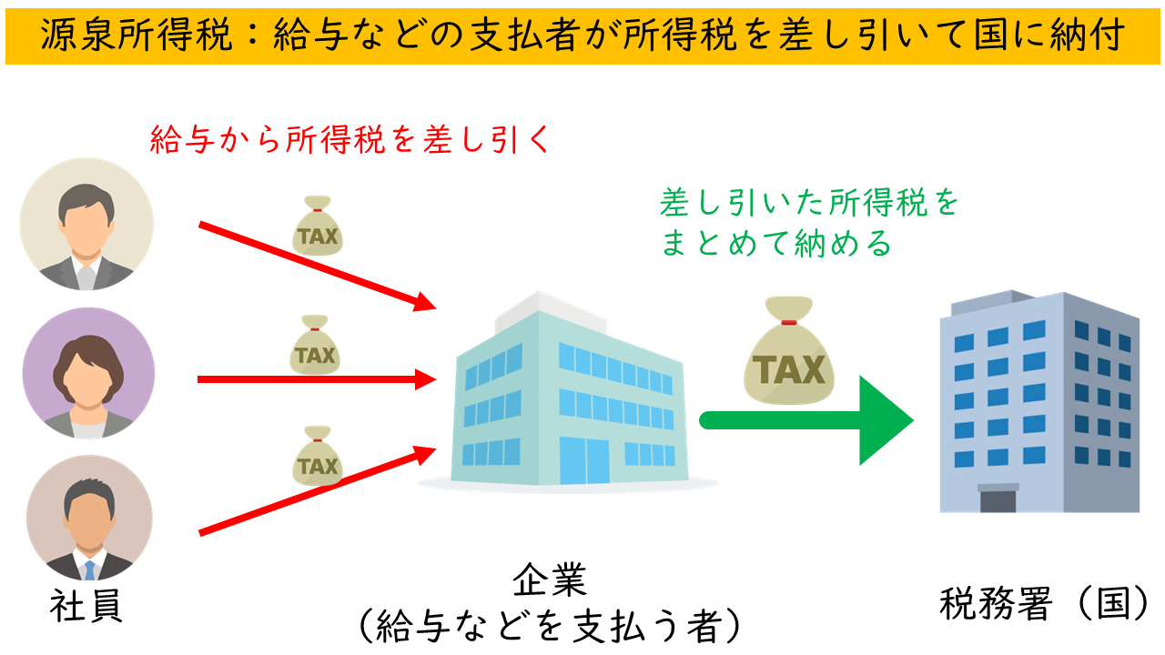 1.源泉所得税の仕組み:企業が従業員の給与から所得税を預かって国に支払う