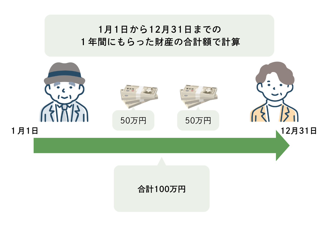 2-2.【特徴2】1月1日から12月31日までの1年間にもらった財産の合計額で税額を計算する