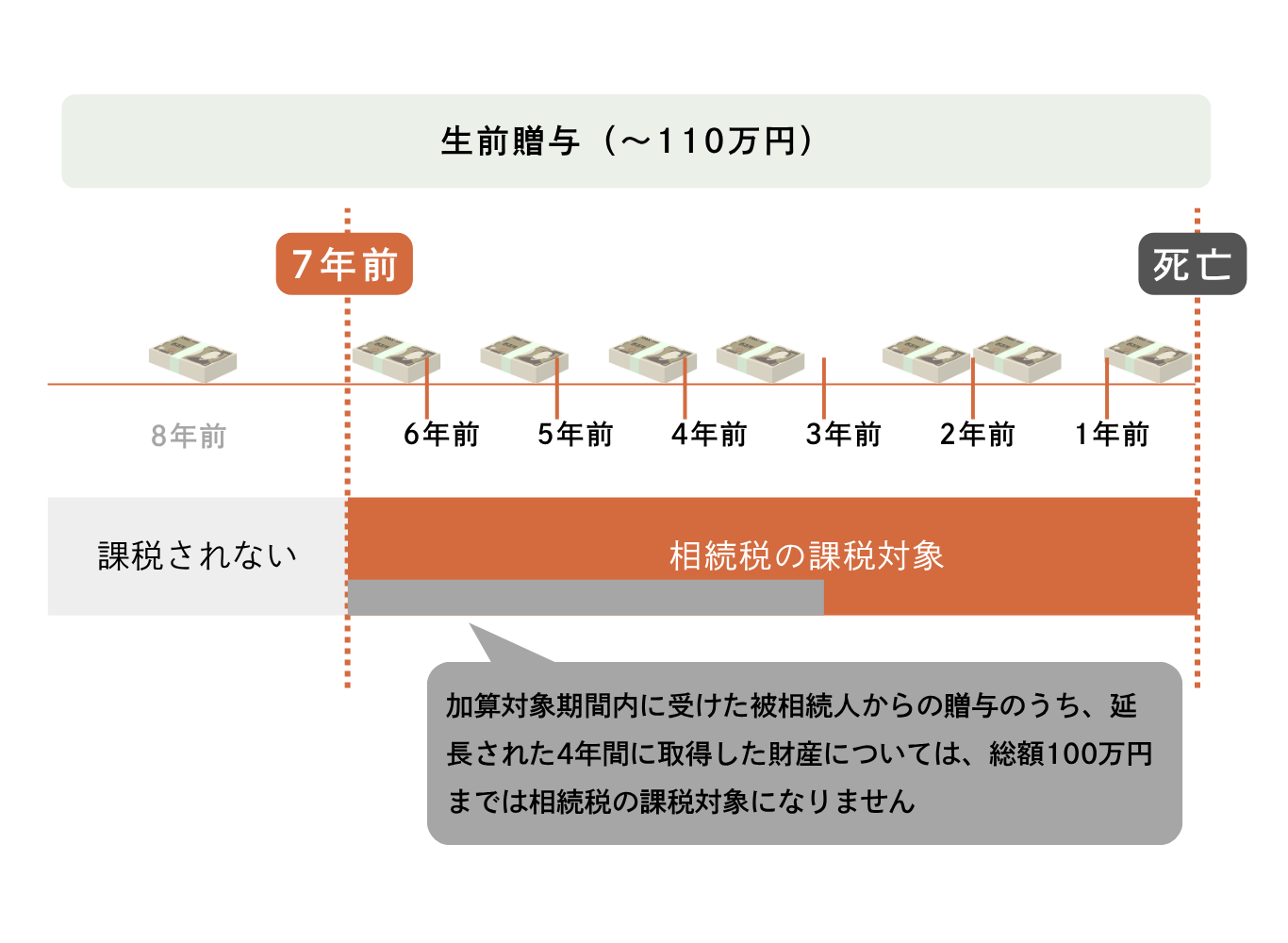 ※上の図は加算対象期間が7年の場合です。2024年以降の相続からは、「生前贈与加算」の対象期間が段階的に3年から7年に延長されています。詳細は下記をご覧ください。
