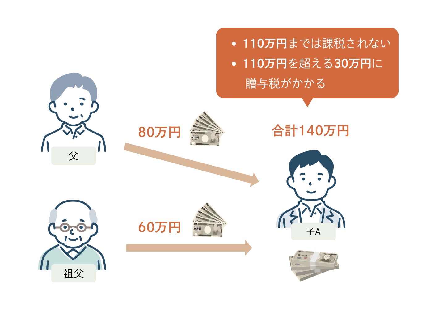 たとえば、子Aが祖父から60万円・父親から80万円をもらった場合、合計140万円となり、110万円を超えた30万円に贈与税がかかります。祖父からも父親からもそれぞれ110万円以下だから贈与税はかからない、とはなりませんのでご注意ください。