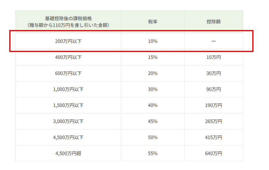 2-3.【特徴3】受け取った財産が110万円以内であれば贈与税がかからない(基礎控除)