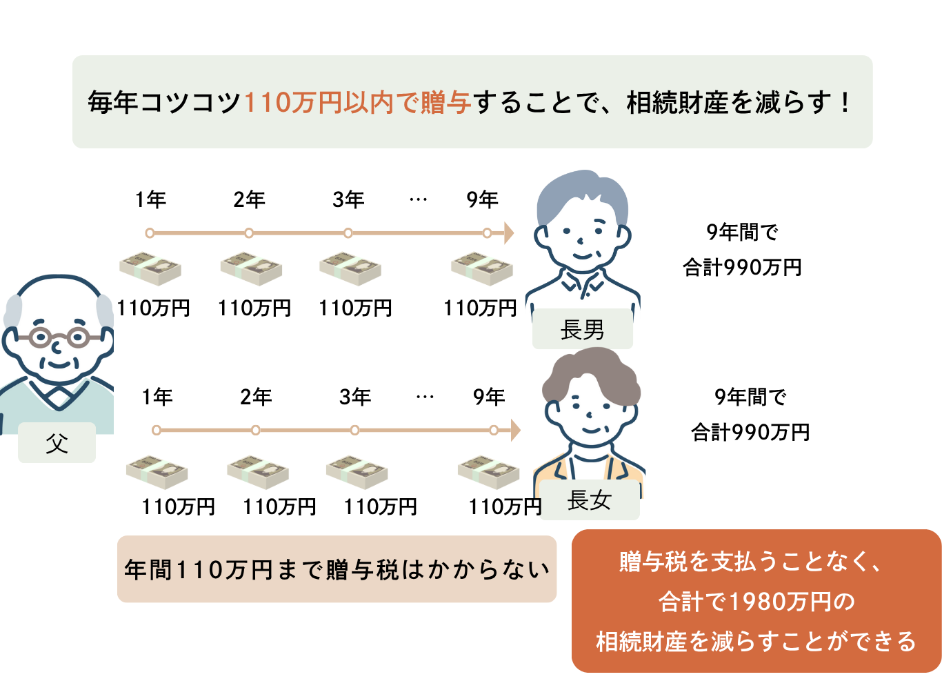 毎年110万円以内の贈与を繰り返すことで、時間をかけて少しずつ財産を子や孫に移すことができるのです。この方法は、将来の相続財産を減らし、結果的に相続税の負担を軽くする効果が期待できます。