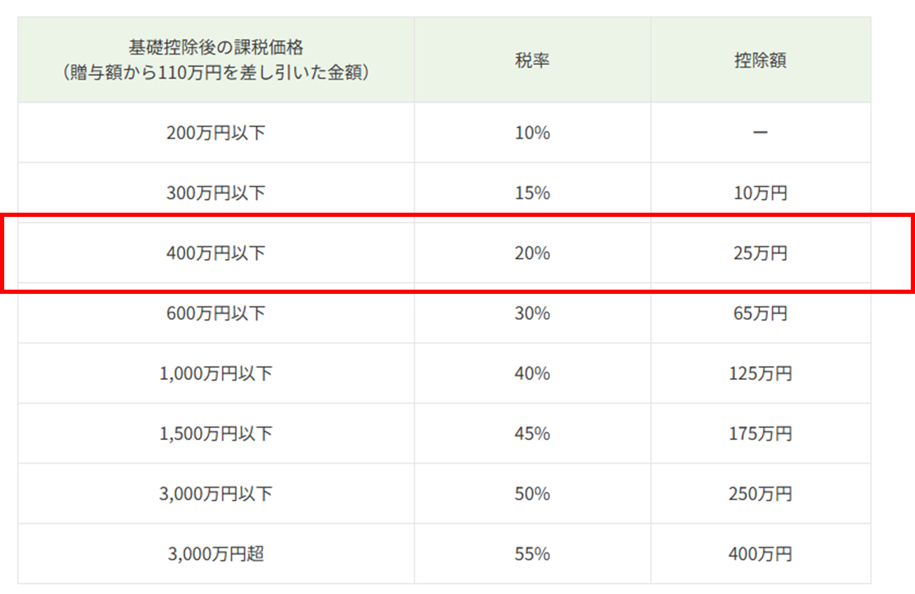 贈与税額は、390万円 × 20% − 25万円 = 53万円です。