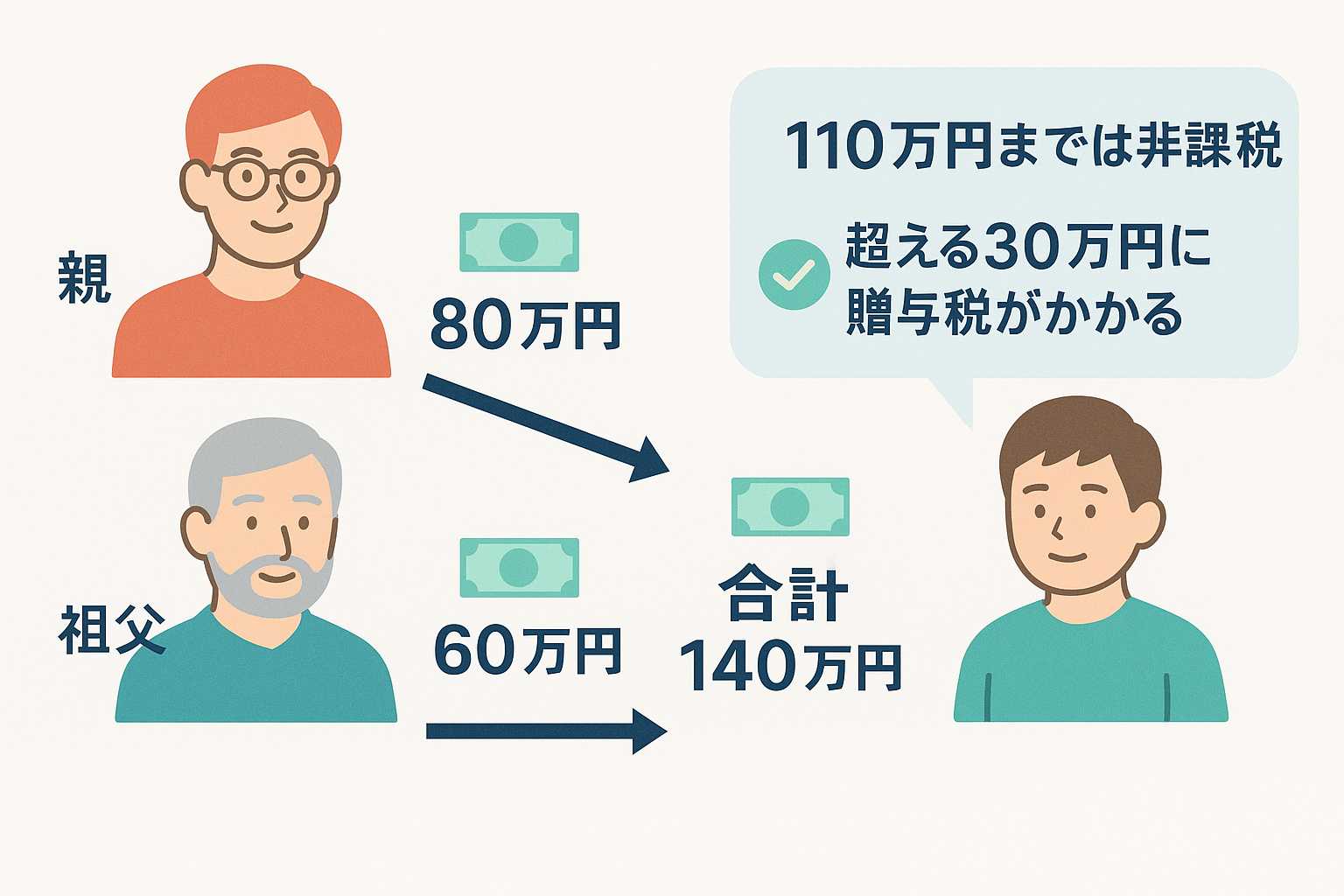 親から100万円、祖母から100万円 → 合計200万円 − 110万円 = 90万円に課税される