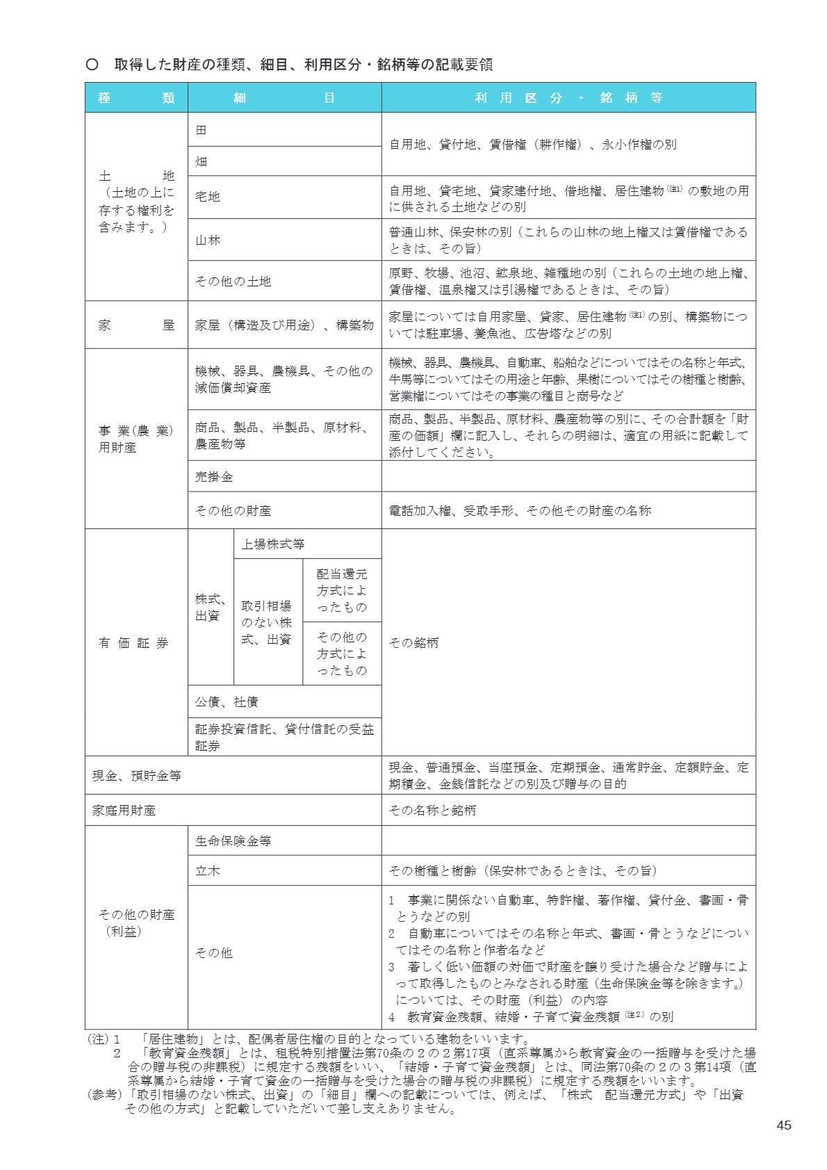 ■国税庁 取得した財産の種類、細目、利用区分・銘柄等の記載要領