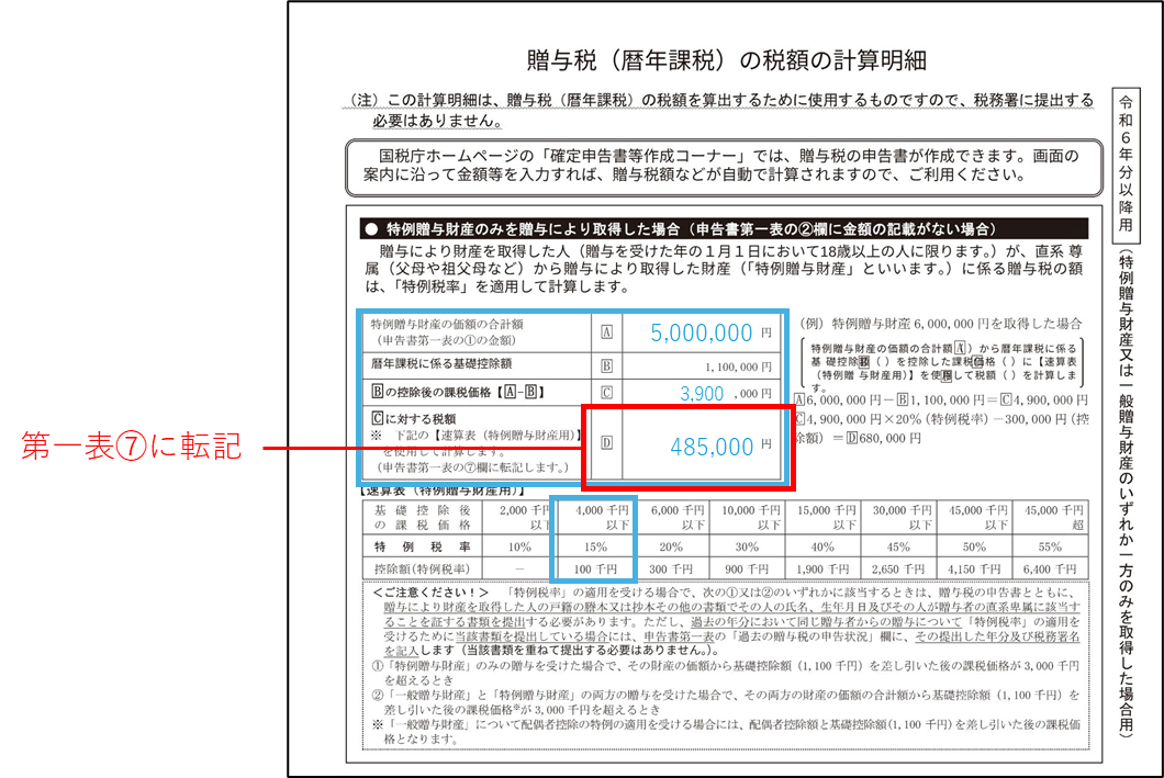 今回の例では、500万円の特例贈与財産(第一表の①を計算明細のAに記入)ですので、計算式は下記となります。
