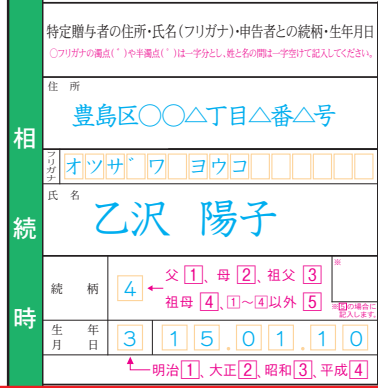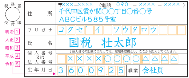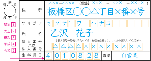 「生年月日」の和暦は、明治は「1」、大正は「2」、昭和は「3」、平成は「4」、令和は「5」と記入します。
