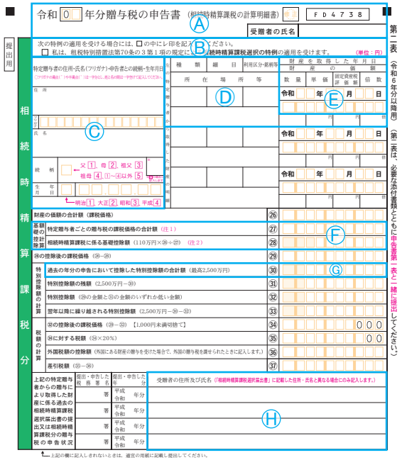 また、相続時精算課税を適用する場合に使用する第二表は、贈与者ごとに作成するため、贈与者が複数いる場合には、その人数分の枚数を使用することになります。