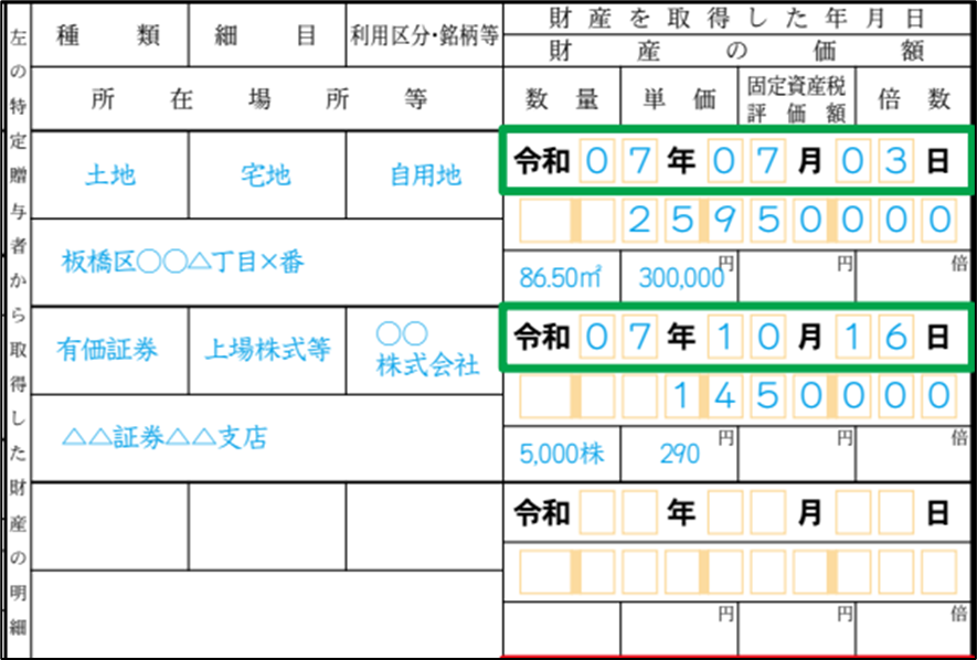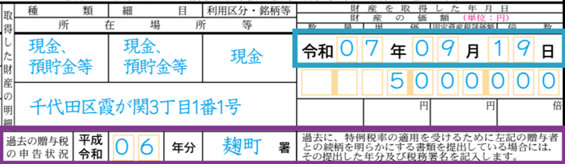 「財産を取得した年月日」には、贈与を受けた年月日を記入します。