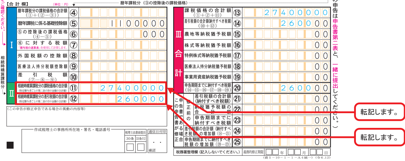 次に他に贈与財産がなければ、第一表の左下【合計欄】④に転記します。