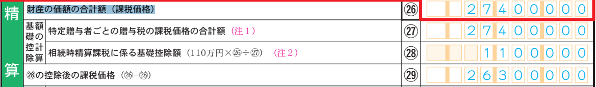 相続時精算課税制度を選択して贈与をした人(特定贈与者)が複数いる場合には、㉗「特定贈与者ごとの贈与税の課税価格の合計額」には、そのすべての特定贈与者からもらった財産の価格を合計した金額を記入します。今回の例では、特定贈与者が1人なので、㉖と㉗の金額は同じ金額となっています。